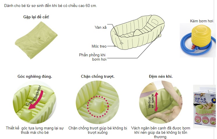 Chậu tắm phao cho bé Richell Nhật Bản thiết kế thông minh dạng phao tiện dụng, chất liệu cao cấp, dung tích sau khi bơm phao lên có thể chứa được 34 lít nước, nhưng chỉ cần 15 lít nước là đã đủ lượng nước tắm cho bé, khả năng chống trơn trượt