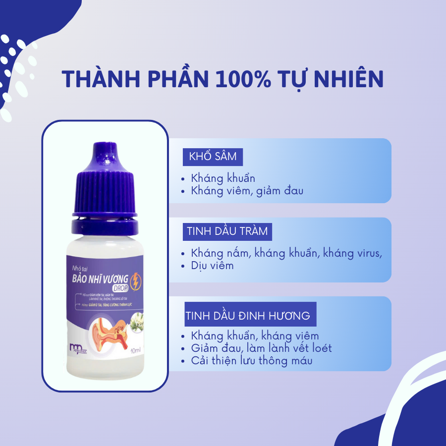 Dung dịch nhỏ tai Bảo Nhĩ Vương Drop được chiết xuất hoàn toàn tự nhiên, lành tính, dạng dung dịch thẩm thấu hiệu quả nhanh, hỗ trợ giảm viêm, nấm, làm dịu , thông thoáng lỗ tai, giúp cải thiện chức năng nghe rõ tốt hơn