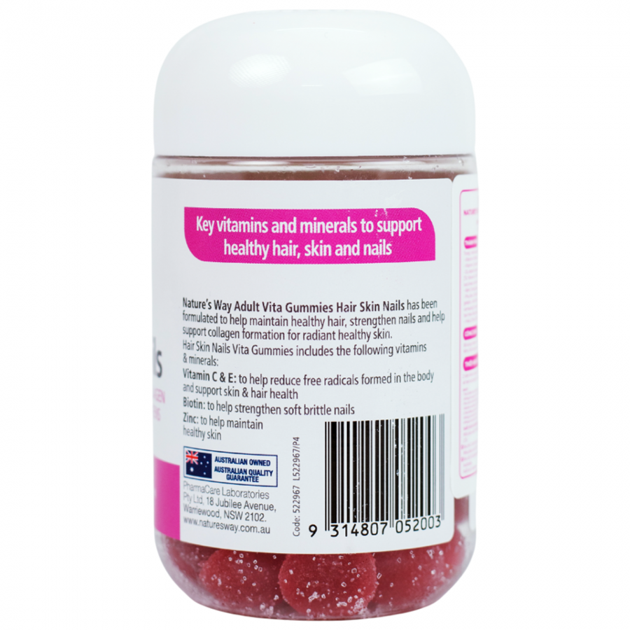 Nature's Way Adult Vita Gummies Hair Skin Nails dạng kẻo dẹo với hương vị trái cây dễ dùng giúp bổ sung Vitamin C, E, Biotin và kẽm hỗ trợ da, tóc móng khỏe mạnh.
