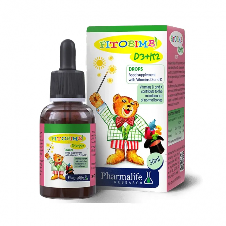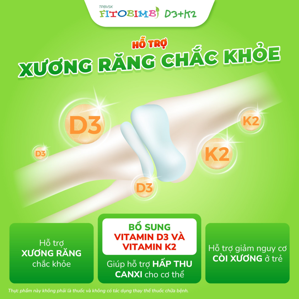 Siro Fitobimbi D3 + K2 cho bé giúp bổ sung vitamin D3 và K2, hỗ trợ tăng cường hấp thu canxi, giúp trẻ phát triển xương răng chắc khỏe và phòng ngừa còi xương.