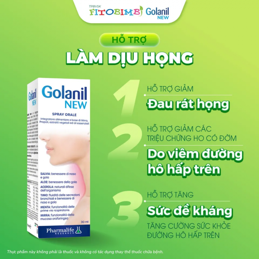 | Tên sản phẩm | Xịt họng hỗ trợ giảm ho Fitobimbi Golanil New |