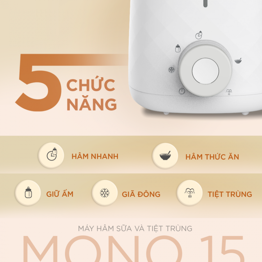 Máy hâm sữa và tiệt trùng Fatzbaby Mono 15 được thiết kế với công suất lên đến 500W, giúp làm ấm nhanh chỉ trong khoảng 6 phút và tiệt trùng hiệu quả. Sản phẩm tích hợp 5 chức năng quan trọng trong một thiết bị gọn nhẹ, thao tác đơn giản, giúp mẹ chủ động hơn và tiết kiệm đáng kể thời gian khi chăm sóc bé mỗi ngày.