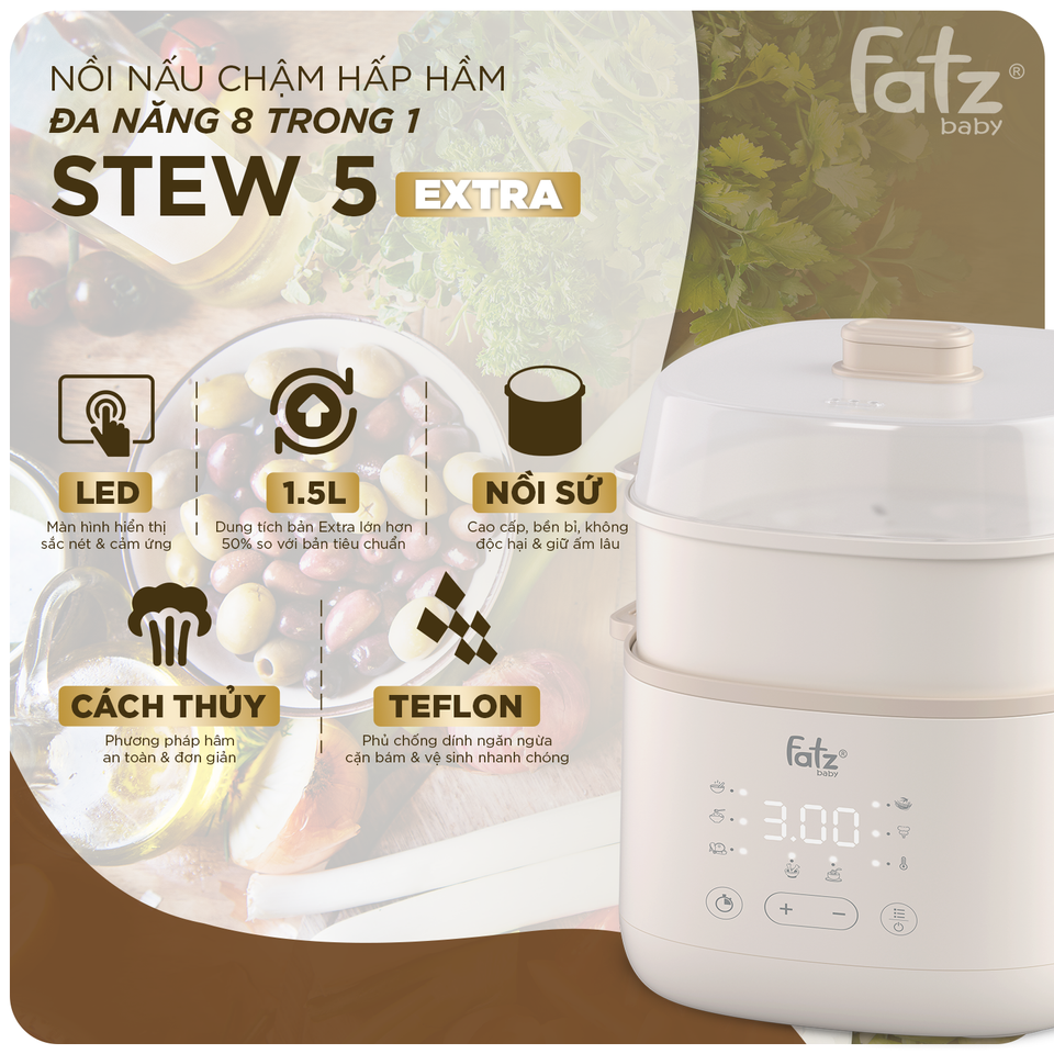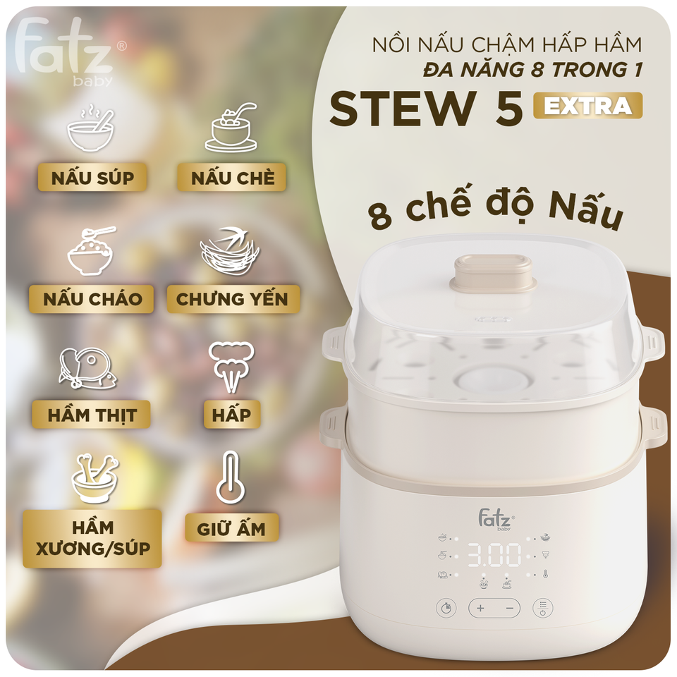 Nồi nấu chậm hấp hầm đa năng 8in1 Fatzbaby Stew 5 Extra sử dụng phương pháp chưng cách thủy, giúp nấu chậm giữ nguyên dưỡng chất và hương vị của món ăn. Nồi tích hợp 8 chức năng từ nấu cháo, nấu súp, hầm, chưng yến,... giúp việc nấu nướng trở nên đơn giản và tiện lợi hơn.