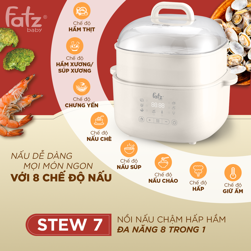 Nồi nấu chậm hấp hầm đa năng 8in1 Fatzbaby Stew 7 sử dụng công nghệ nấu chậm cách thủy hiện đại giúp giữ trọn dưỡng chất và được tích hợp 8 chế độ nấu sẵn (cháo, súp, hầm, chưng yến, giữ ấm...) giúp bạn có thể thoải mái nấu đa dạng món ăn mà không cần canh bếp.
