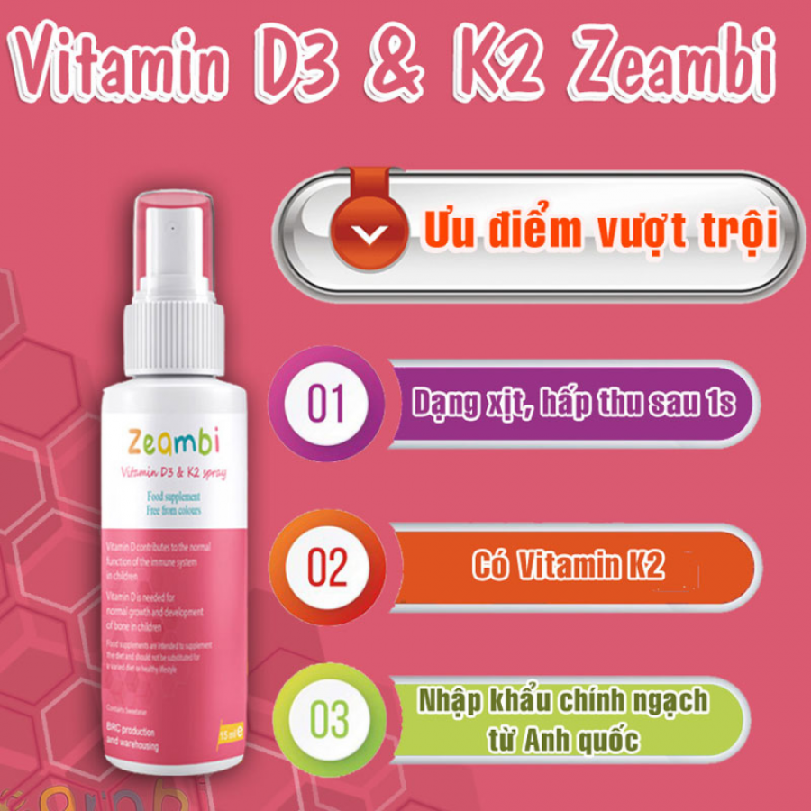 Vitamin D3 & K2 Spray Zeambi dạng xịt cho bé từ 1 tuổi giúp bổ sung Vitamin D3 & Vitamin K2 hỗ trợ tăng cường hấp thu canxi, giúp xương răng khỏe mạnh.