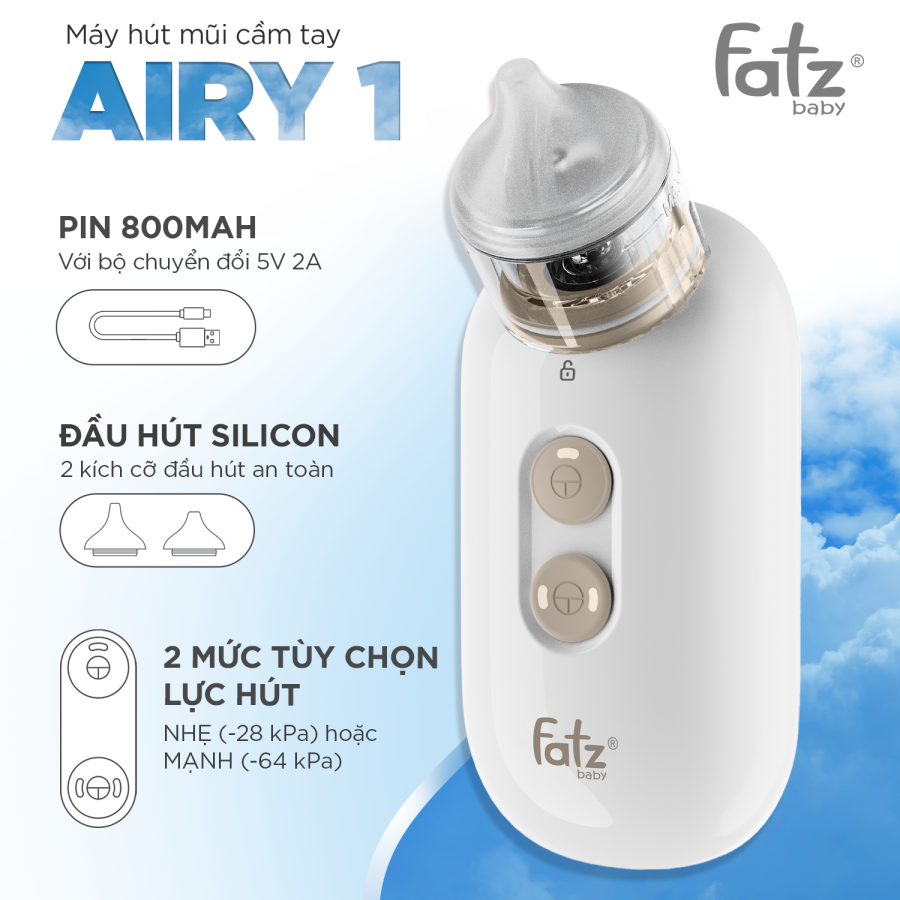 Máy hút mũi cầm tay cho bé Fatzbaby Airy 1 NC007 có lực hút mạnh mẽ, độ ồn thấp duy trì hút bé không bị giật mình hay khó chịu khi sử dụng, được trang bị pin sạc lithium-ion dung lượng lớn 800mAh, cho phép tái sạc nhiều lần tiện dụng