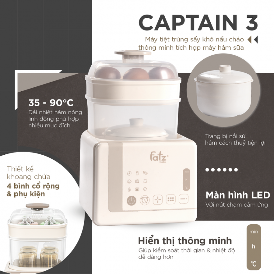 Fatzbaby Captain 3 FB4326SL với thiết kế tích hợp 8 chức năng trong 1 thiết bị, Captain 3 không chỉ giúp tiệt trùng, sấy khô và bảo quản bình sữa, mà còn hâm sữa, hấp thực phẩm, giữ ấm, nấu cháo chậm và làm sữa chua.