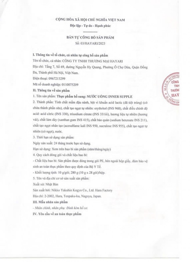 | Tên sản phẩm | Nước uống hỗ trợ tiết tố nữ Inner Supple của Nhật |