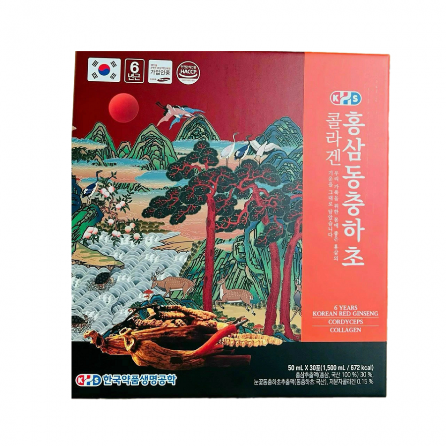 Nước uống hồng sâm collagen đông trùng hạ thảo KHS Hàn Quốc chứa chiết xuất hồng sâm 6 năm tuổi, đông trùng hạ thảo và Collagen cùng nhiều thành phần tự nhiên quý giá giúp tăng cường sức khỏe từ bên trong, duy trì vẻ đẹp bên ngoài. Hương vị thanh mát, dễ uống.