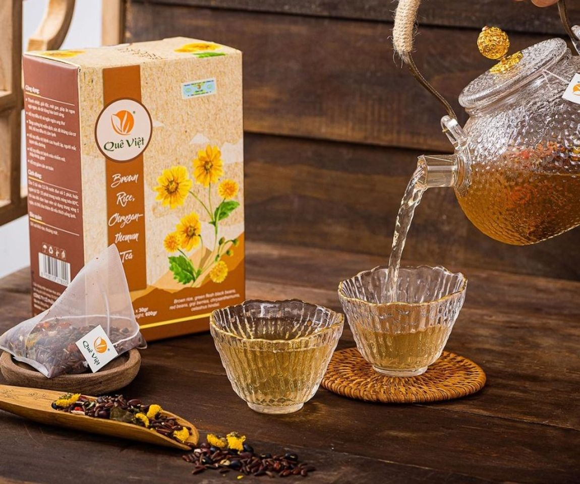 Trà hoa cúc gạo lứt Quê Việt kết hợp từ những thành phần tự nhiên lành tính, mang đến cho người dùng một tách trà thơm ngon và hỗ trợ tốt cho sức khỏe.