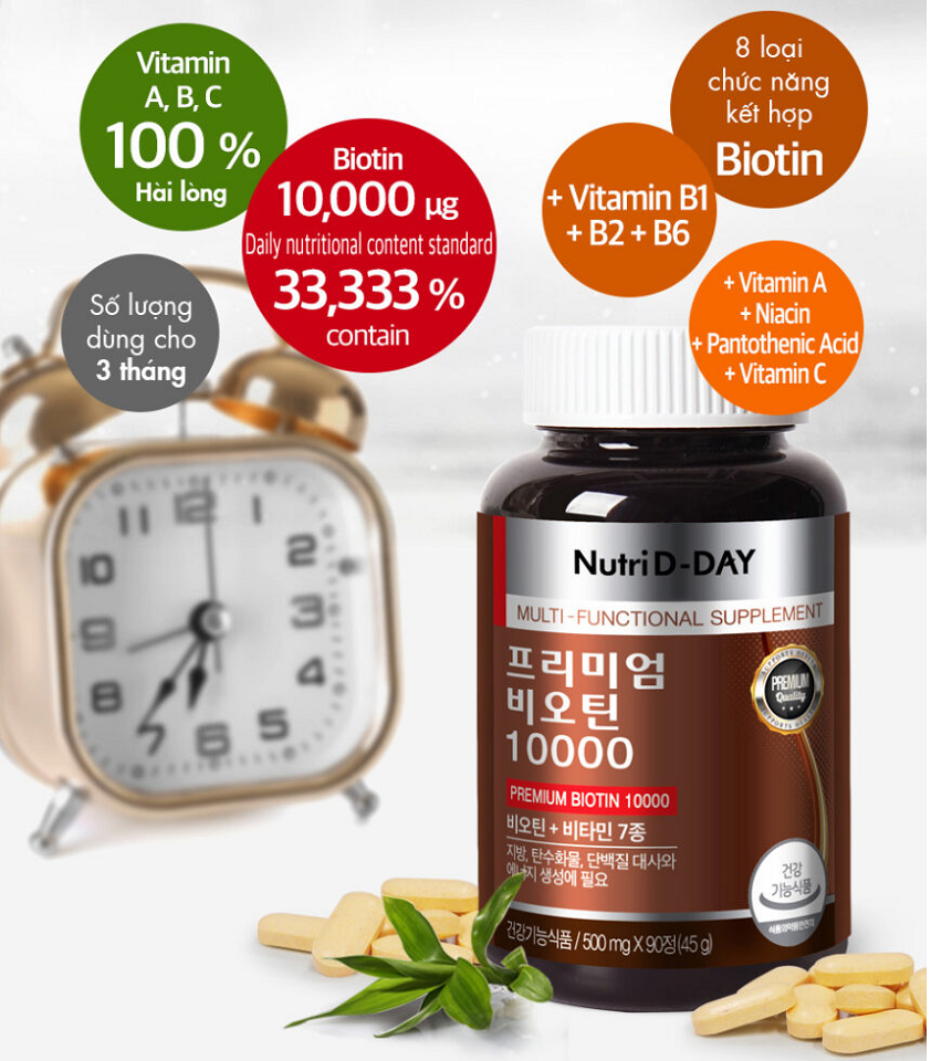 Viên bổ sung biotin Nutri D-Day Premium Biotin 10000 của Hàn Quốc là thực phẩm hỗ trợ bổ sung tốt cho mái tóc, hỗ trợ quá trình hình thành năng lượng, chuyển hóa chất béo, protein, cải thiện tình trạng tóc gãy rụng giúp tóc chắc khỏe hơn.