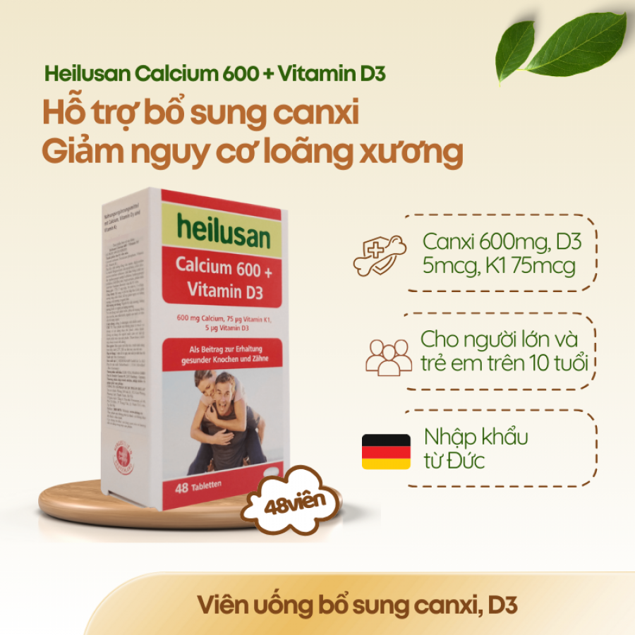 Viên bổ sung canxi Heilusan Calcium 600 + Vitamin D3 của Đức hỗ trợ bổ sung kết hợp vitamin D3 và canxi giúp tăng cường sự hấp thu canxi cho cơ thể, hỗ trợ giúp xương răng chắc khỏe