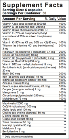 Beta-carotene, ascorbic acid (Vitamin C), cholecalciferol (Vitamin D), d-alpha tocopheryl succinate (Vitamin E), mixed tocopherols, phytonadione (Vitamin K1), menaquinone-4 (Vitamin K2), thiamine HCl, benfotiamine, riboflavin 5 phosphate (Vitamin B5), niacinamide (Niacin), pyridoxal 5 phosphate (Vitamin B6), methylfolate, methycobalamin (Vitamin B12), d-biotin, d-calcium pantothenate (Vitamin B5, pantothenic acid), iron glycinate, potassium iodide, zinc citrate, selenomethionine (selenium), copper sulfate, manganese bysglycinnate chelate, chromium picolinate, molybdenum glycinate chelate, myo-inositol, CoQ10, alpha lipoic acid, choline bitartrate, d-chiro-inositol, grape seed extract, resveratrol (from Polygonum cuspidatum), n-acetyl-cysteine........