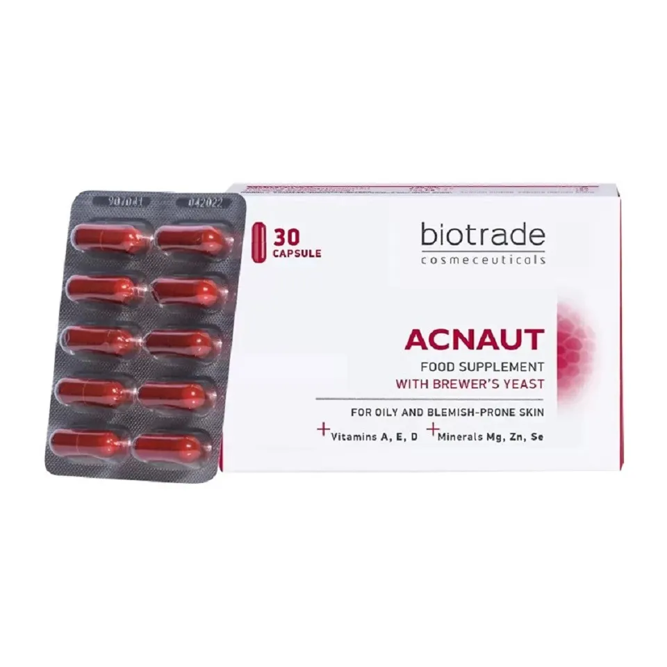 Viên uống Biotrade Acnaut Food Supplement chứa kẽm, vitamin A, E, D,...hỗ trợ giúp giảm dầu, giảm mụn từ bên trong, hỗ trợ làm mờ thâm và phục hồi da khỏe mạnh.
