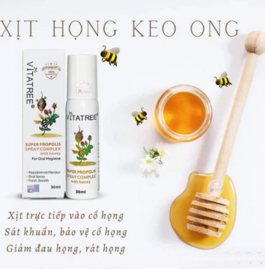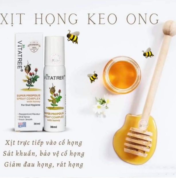Xịt họng keo ong Úc Vitatree Vitatree Super Propolis Spray được chiết xuất từ keo ong thiên nhiên kết hợp với mật ong , dạng xịt thẩm thấu nhanh hỗ trợ làm dịu cổ họng, giảm ho, đờm, thích hợp sử dụng cho bé từ 2 tuổi trở lên, dùng được cho cả người lớn.